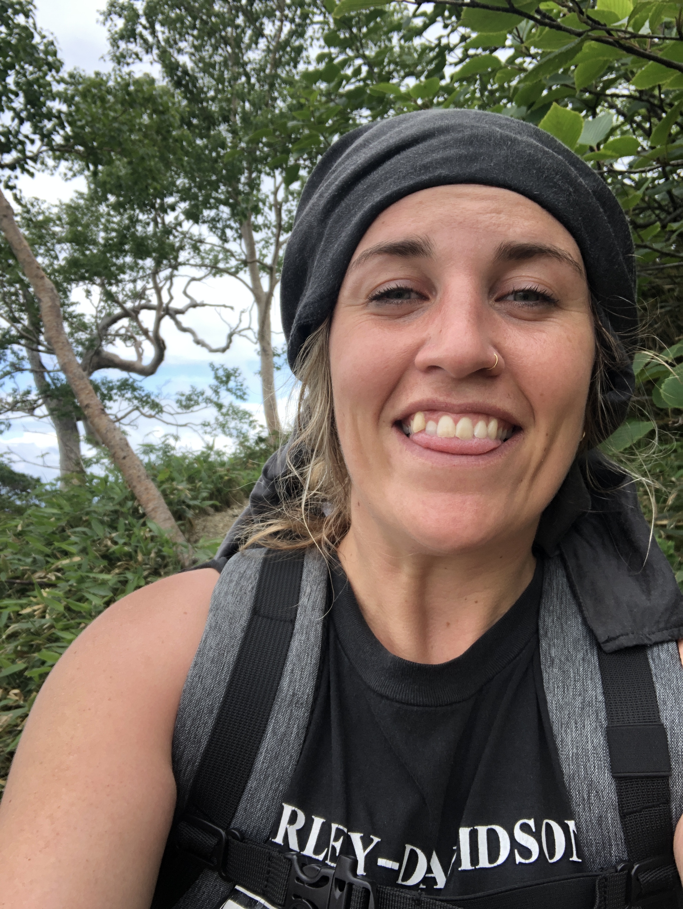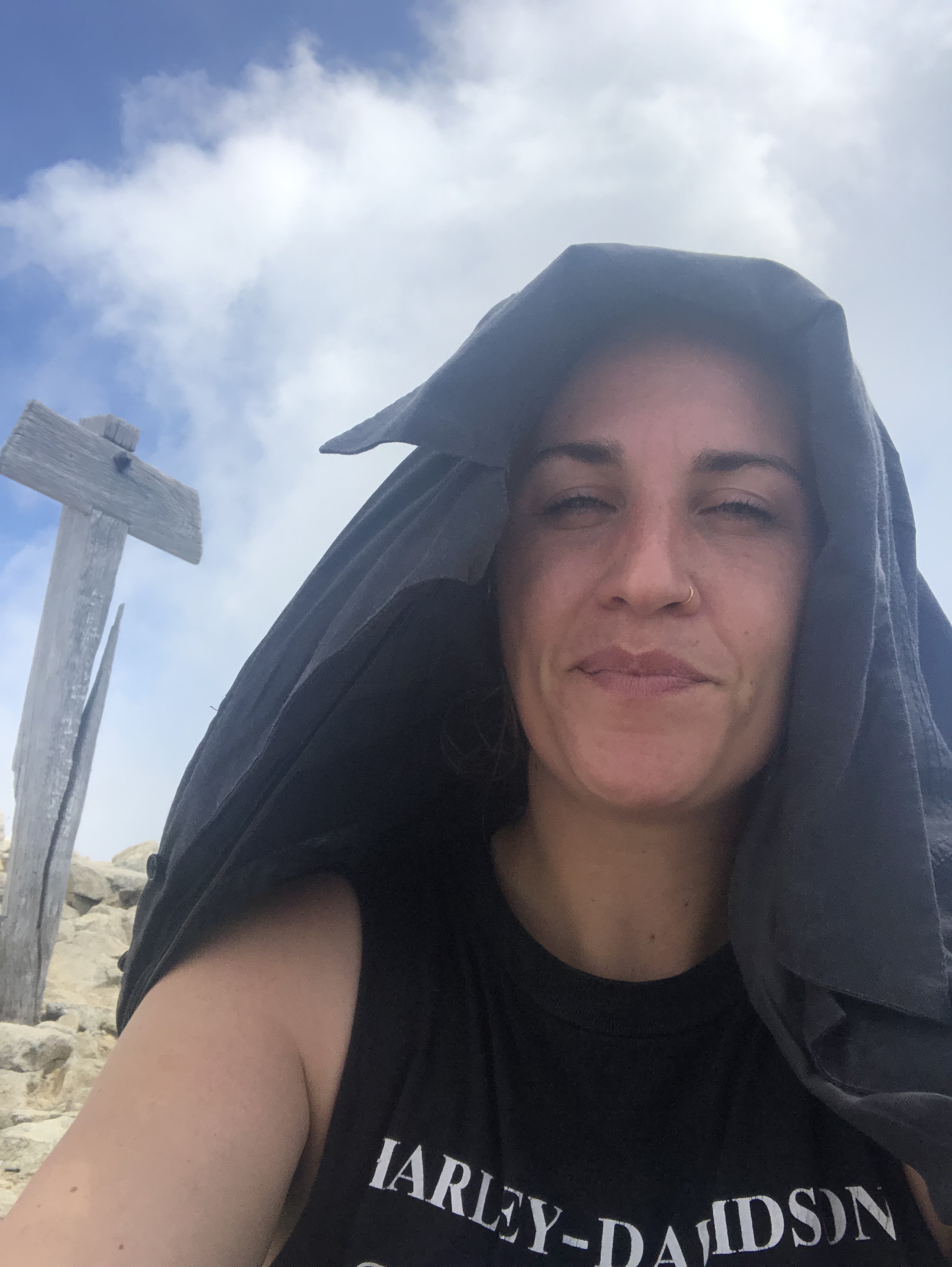 I’m at the top! No water and I forgot my hat again. My face is hot anyway from the exertion, so I can’t tell if I’m getting sunburnt or not. I try to judge by referring to my bike pant line – also hard to tell. Puffing, I tie my light, black over-shirt around my head like a ninja and carry on, feeling slightly silly but also a bit pro-mountain climber. Luckily I can buy water from a vending machine in the lodge clinging to the side of the mountain here. Some girls throw me their can of sunscreen. I’ve never been so happy to slap it on.