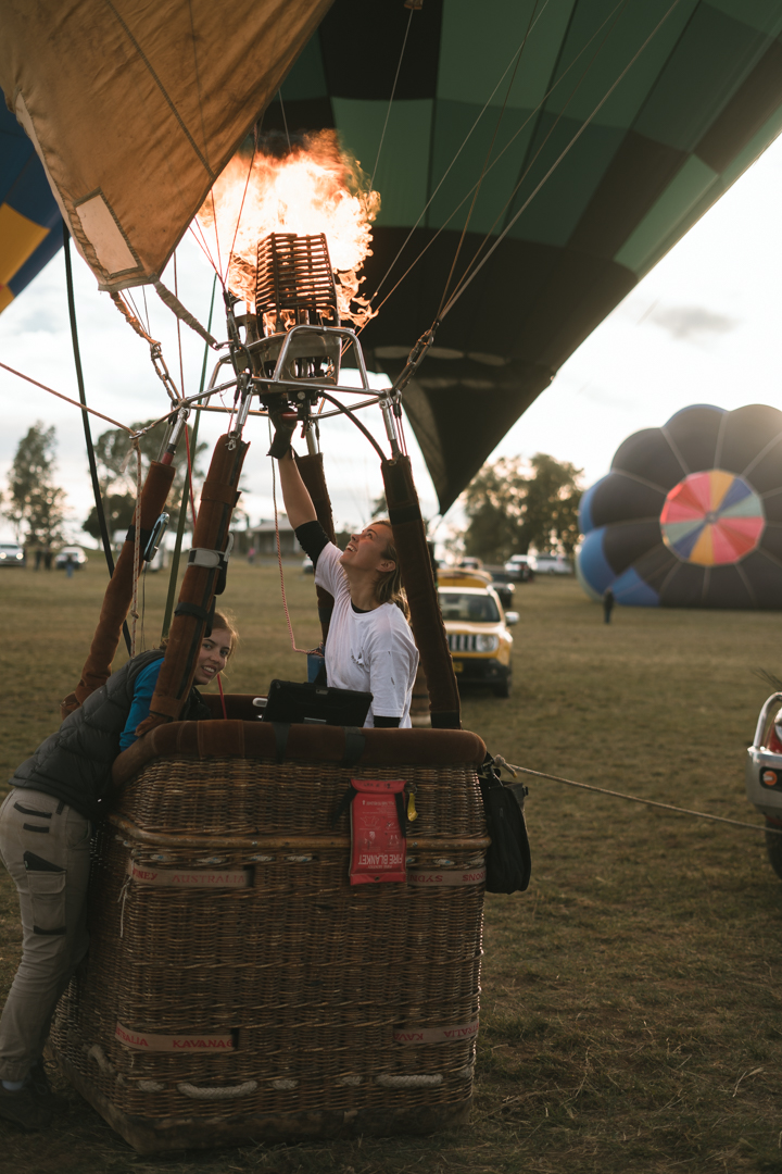 The green flag is raised, and the raspy sounds of twenty inflation fans burst out stark against the crispness of a rural sunrise. There is nothing like being in a paddock at first light to make you feel at one with the land. The spectacle of two dozen balloons inflating within twenty feet of you is overwhelming – so loud you can’t hear yourself think – and, all at once, you are enveloped by the smell of the earth and an overwhelming sense of solidarity. Ours is standing up now. We check that Georgia is organised – markers unravelled and hung on gas tanks in order, instruments velcroed on the burner poles, QNH set, flight computer clipped into place and a radio check – “Bronni, do you read me one, two, three, four?”