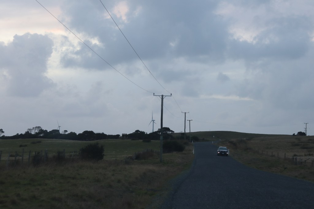 MID: Approaching Currie from the south at dusk, the Huxley Hill wind turbines in the distance
