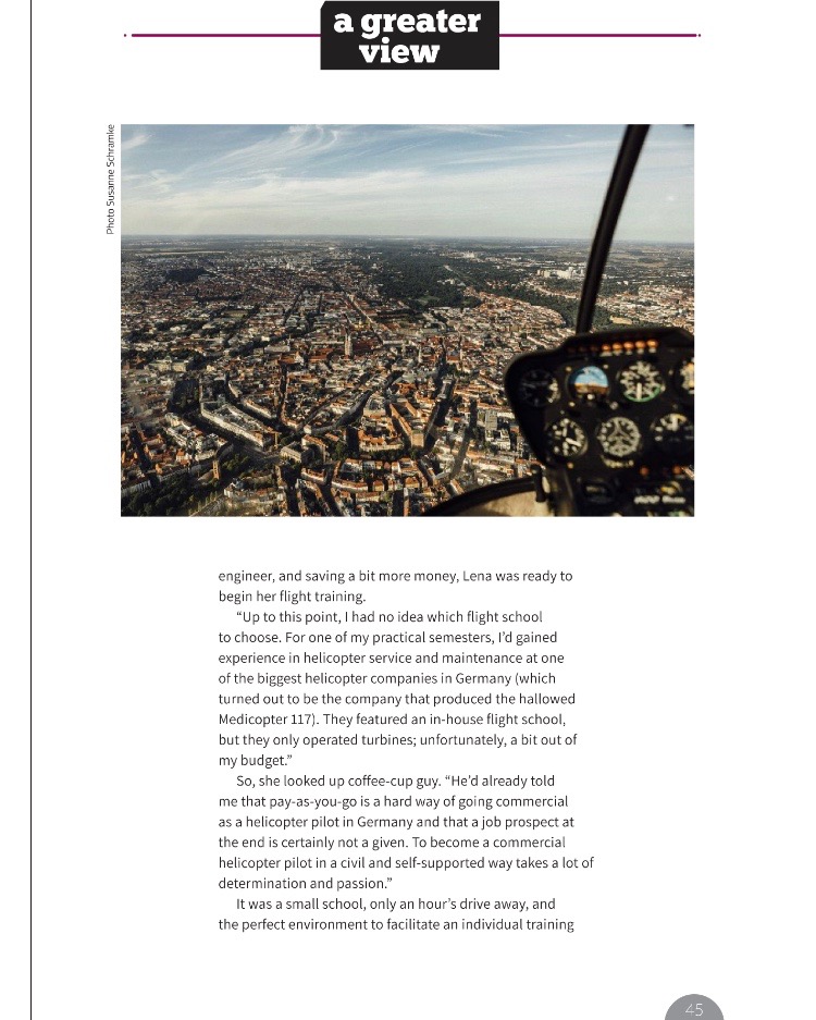 It was a small school, only an hour’s drive away, and the perfect environment to facilitate an individual training plan that would go hand-in-hand with her full-time job as an engineer. Having completed her theoretical exams beforehand so she could focus on the flying, practical training took Lena just seven months all up. She passed her final PPL check ride at the end of 2018 and flew her first heli championship as pilot-in-command soon after.