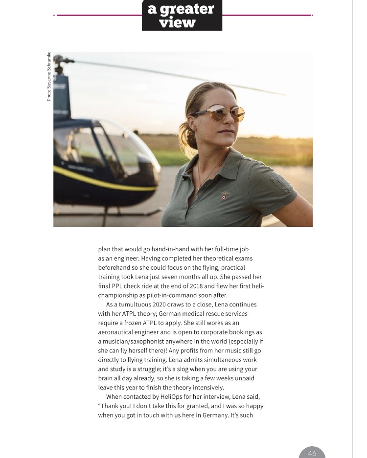 When contacted by HeliOps for her interview, Lena said, “Thank you! I don’t take this for granted, and I was so happy when you got in touch with us here in Germany. It’s such a great chance to share the stories. I am not even flying commercially yet, and there have been so many amazing women and girls from the heli industry profiled in this space. I hope to be there soon myself.”