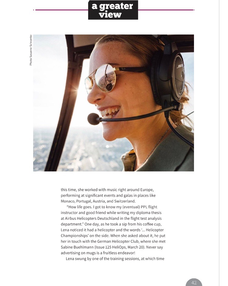 “How life goes. I got to know my (eventual) PPL flight instructor and good friend while writing my diploma thesis at Airbus Helicopters Deutschland in the flight test analysis department.” One day, as he took a sip from his coffee cup, Lena noticed it had a helicopter and the words ‘… Helicopter Championships’ on the side. When she asked about it, he put her in touch with the German Helicopter Club, where she met Sabine Buehlmann (Issue 125 HeliOps, March 20). Never say advertising on mugs is a fruitless endeavour!