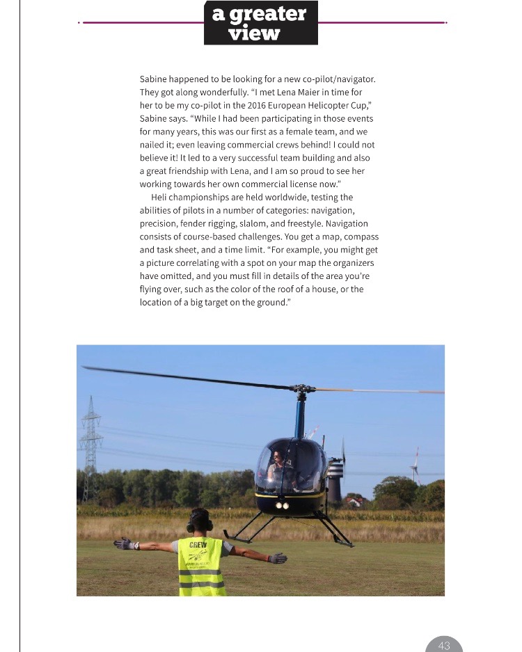 Lena swung by one of the training sessions – at which time Sabine happened to be looking for a new co-pilot/navigator. They got along wonderfully. “I met Lena Maier in time for her to be my co-pilot in the 2016 European Helicopter Cup,” Sabine says. “While I had been participating in those events for many years… this was our first as a female team, and we nailed it – even leaving commercial crews behind! I could not believe it! It led to a very successful team building and also a great friendship with Lena, and I am so proud to see her working towards her own commercial license now.”