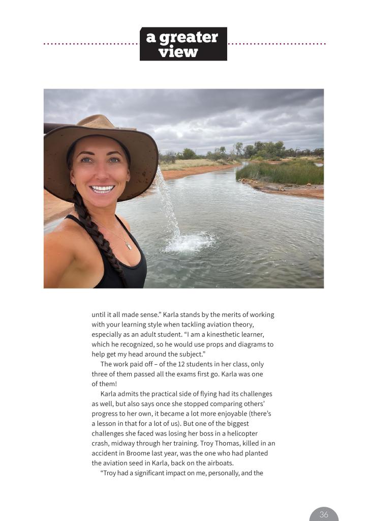 Karla admits the practical side of flying had its challenges as well, but also says once she stopped comparing others’ progress to her own, it became a lot more enjoyable (there’s a lesson in that for a lot of us). But one of the biggest challenges she faced was losing her boss in a helicopter crash, midway through her training. Troy Thomas, killed in an accident in Broome last year, was the one who had planted the aviation seed in Karla, back on the airboats.