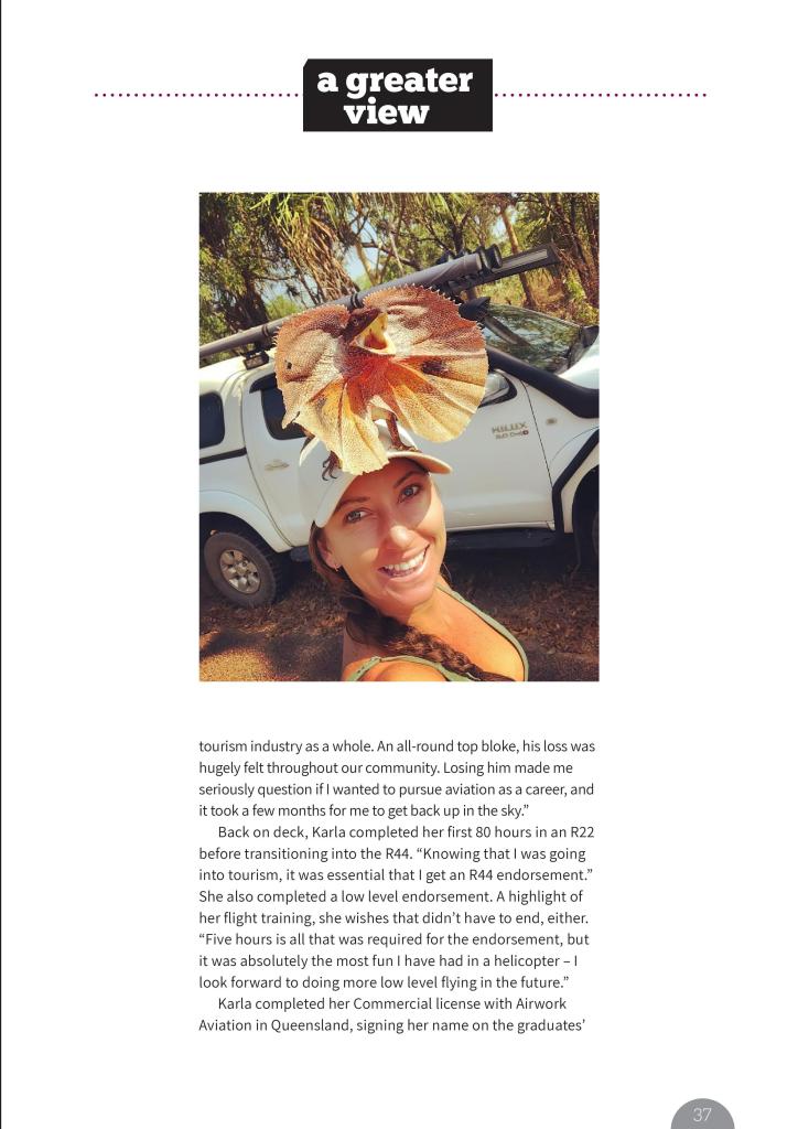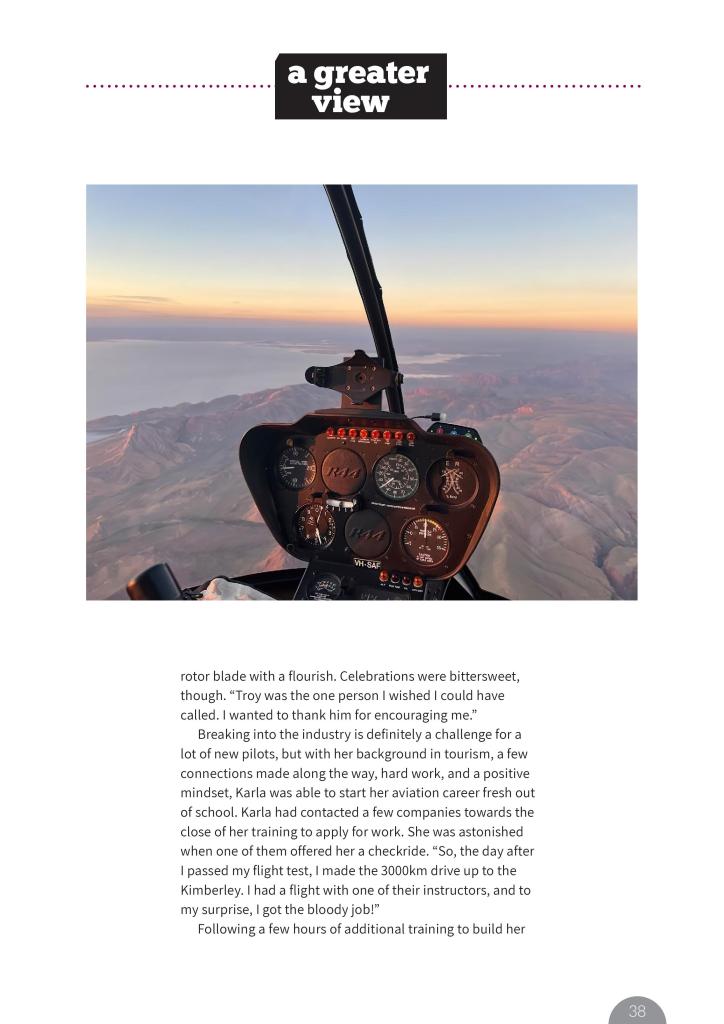 Karla completed her Commercial license with Airwork Aviation in Queensland, signing her name on the graduates’ rotor blade with a flourish. Celebrations were bittersweet, though. “Troy was the one person I wished I could have called. I wanted to thank him for encouraging me.”