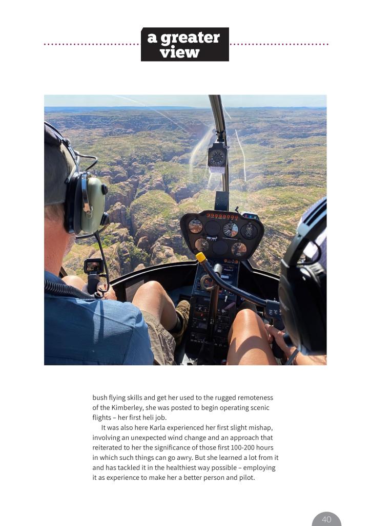 Following a few hours of additional training to build her bush flying skills and get her used to the rugged remoteness of the Kimberley, she was posted to begin operating scenic flights – her first heli job.