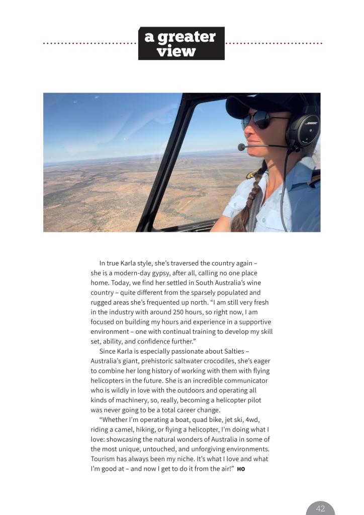 “Whether I’m operating a boat, quad bike, jet ski, 4wd, riding a camel, hiking, or flying a helicopter, I’m doing what I love: showcasing the natural wonders of Australia in some of the most unique, untouched, and unforgiving environments. Tourism has always been my niche. It’s what I love and what I’m good at – and now I get to do it from the air!”