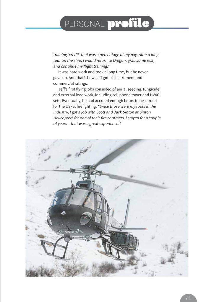 Jeff’s first flying jobs consisted of aerial seeding, fungicide, and external load work, including cell phone tower and HVAC sets. Eventually, he had accrued enough hours to be carded for the USFS, firefighting. “Since those were my roots in the industry, I got a job with Scott and Jack Sinton at Sinton Helicopters for one of their fire contracts. I stayed for a couple of years – that was a great experience.”