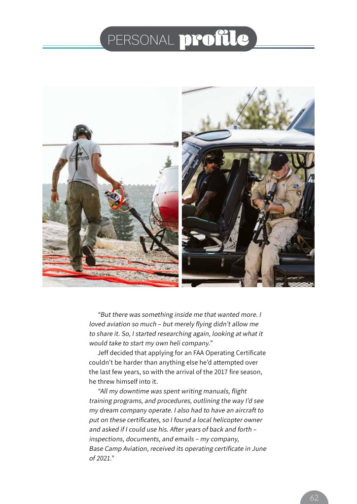 “All my downtime was spent writing manuals, flight training programs, and procedures, outlining the way I’d see my dream company operate. I also had to have an aircraft to put on these certificates, so I found a local helicopter owner and asked if I could use his. After years of back and forth – inspections, documents, and emails – my company, Base Camp Aviation, received its operating certificate in June of 2021.”