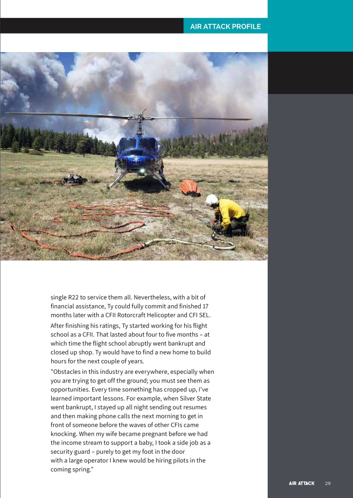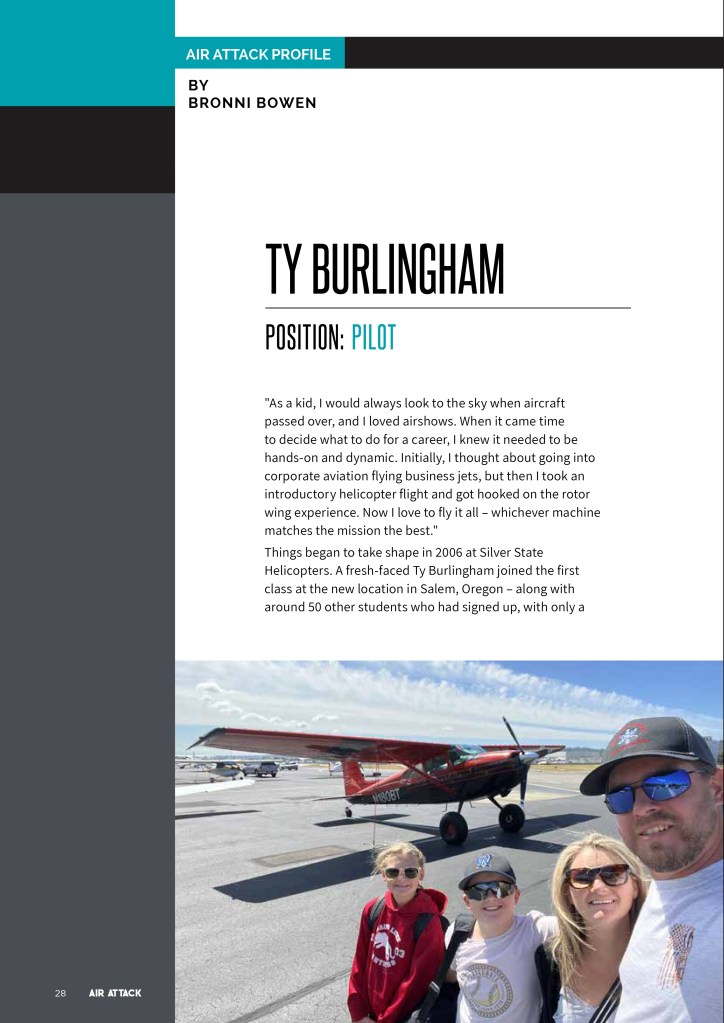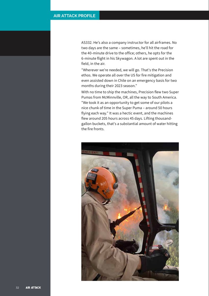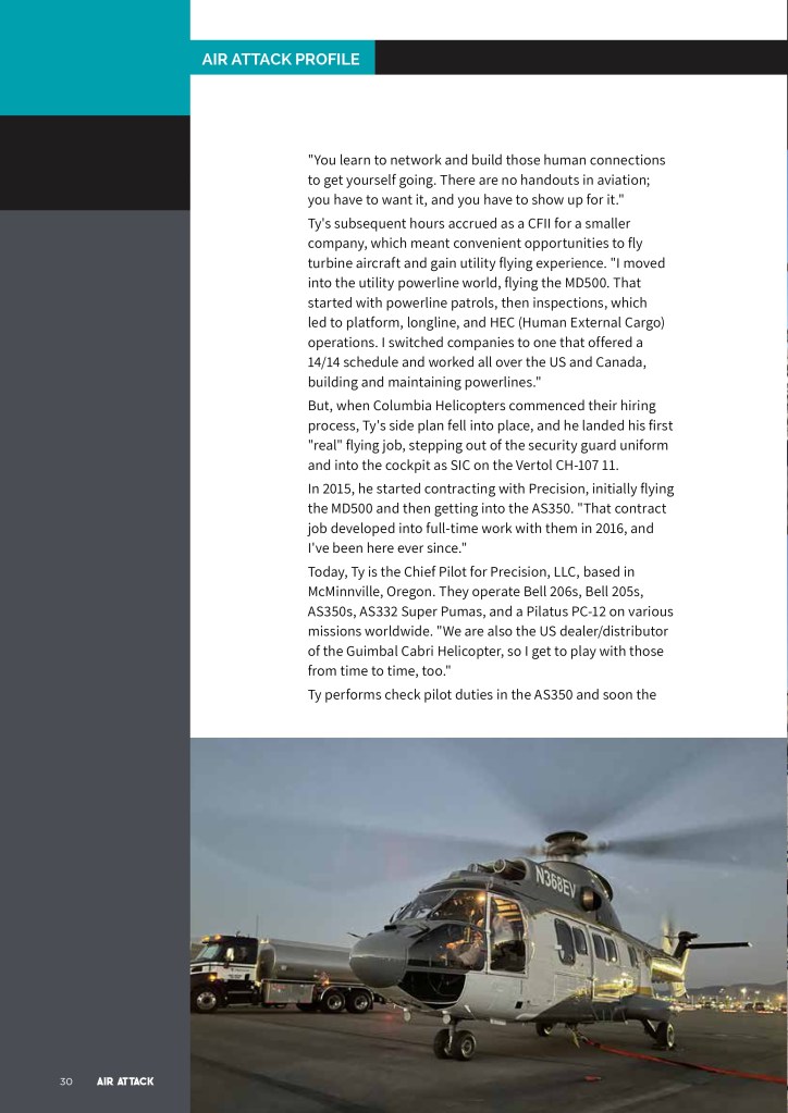 Today, Ty is the Chief Pilot for Precision, LLC, based in McMinnville, Oregon. They operate Bell 206s, Bell 205s, AS350s, AS332 Super Pumas, and a Pilatus PC-12 on various missions worldwide. “We are also the US dealer/distributor of the Guimbal Cabri Helicopter, so I get to play with those from time to time, too.”