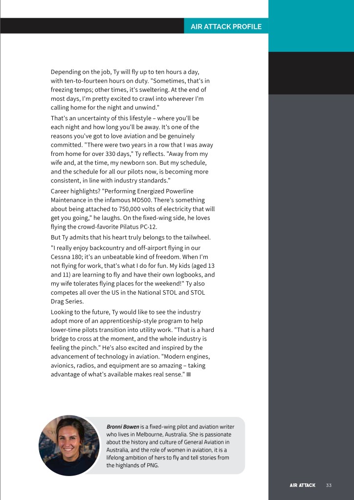 Looking to the future, Ty would like to see the industry adopt more of an apprenticeship-style program to help lower-time pilots transition into utility work. “That is a hard bridge to cross at the moment, and the whole industry is feeling the pinch.” He’s also excited and inspired by the advancement of technology in aviation. “Modern engines, avionics, radios, and equipment are so amazing – taking advantage of what’s available makes real sense.”