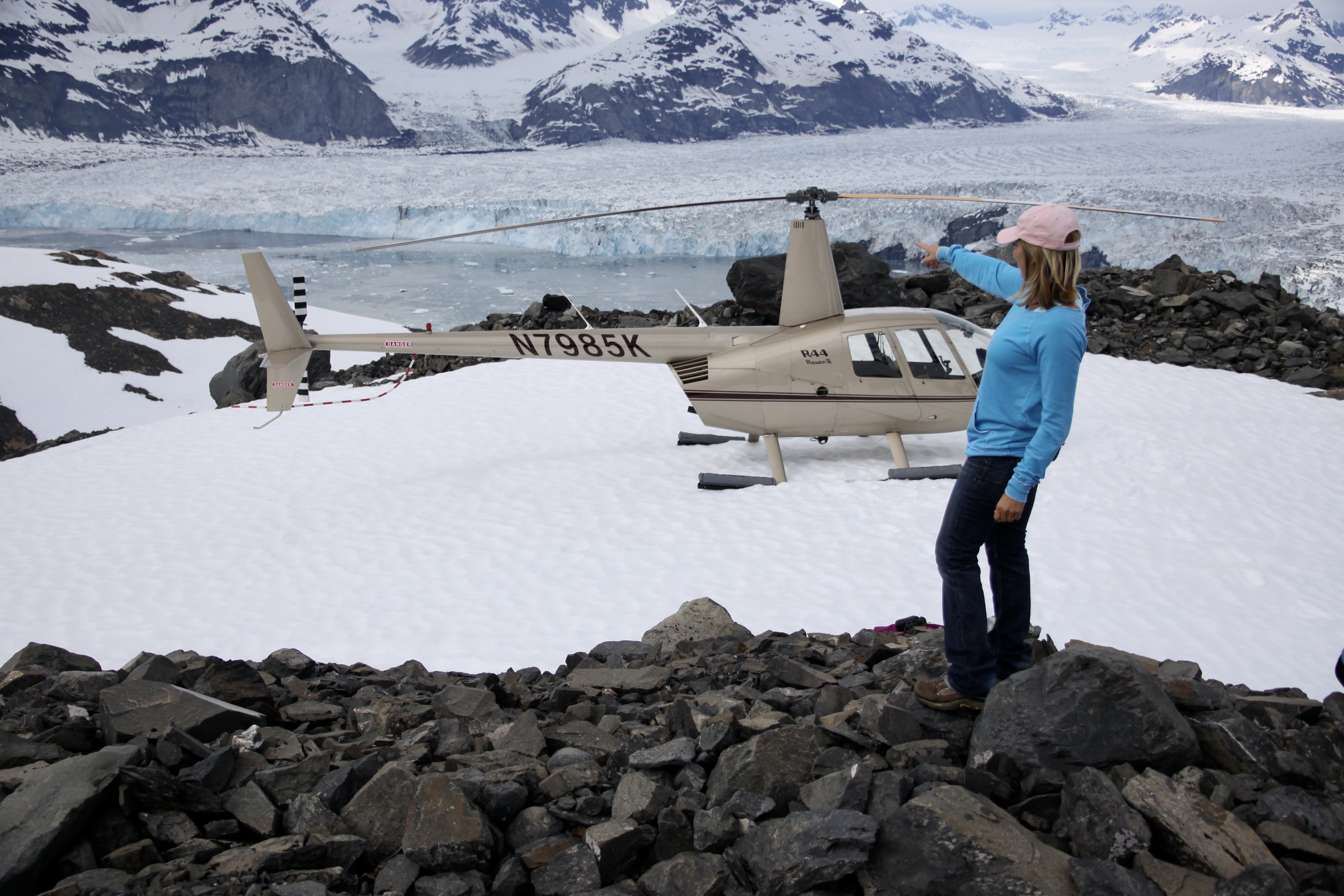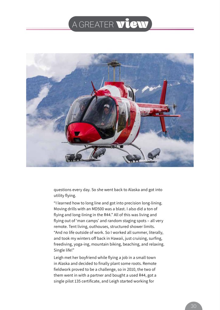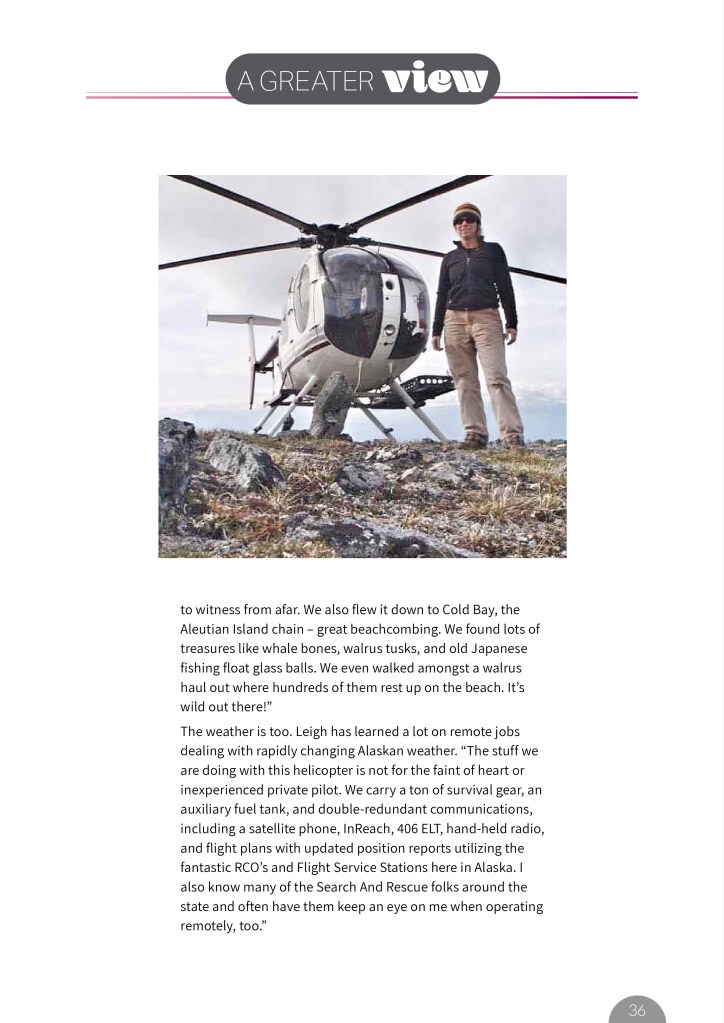 Leigh met her boyfriend while flying a job in a small town in Alaska and decided to finally plant some roots. Remote fieldwork proved to be a challenge, so in 2010, the two of them went in with a partner and bought a used R44, got a single pilot 135 certificate, and Leigh started working for herself based in their new home of Valdez. “It is still the most beautiful flying I’ve ever experienced. I was mostly servicing the mountain top repeater sites – building, updating, and maintaining. It’s all done by helicopter as there are no roads.”