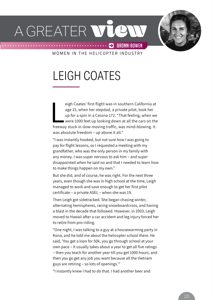 Leigh Coate’s first flight was in southern California at age 15, when her stepdad, a private pilot, took her up for a spin in a Cessna 172. “That feeling, when we were 1000 feet up looking down at all the cars on the freeway stuck in slow-moving traffic, was mind-blowing. It was absolute freedom – up above it all.”