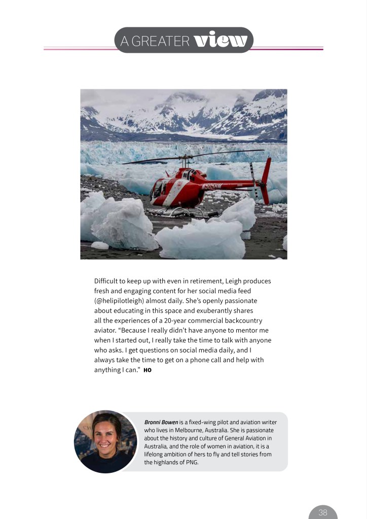 Difficult to keep up with even in retirement, Leigh produces fresh and engaging content for her social media feed (@helipilotleigh) almost daily. She’s openly passionate about educating in this space and exuberantly shares all the experiences of a 20-year commercial backcountry aviator. “Because I really didn’t have anyone to mentor me when I started out, I really take the time to talk with anyone who asks. I get questions on social media daily, and I always take the time to get on a phone call and help with anything I can.”