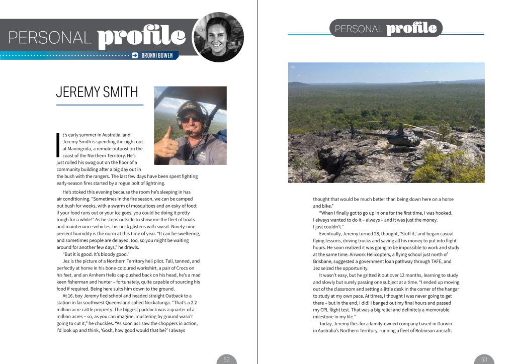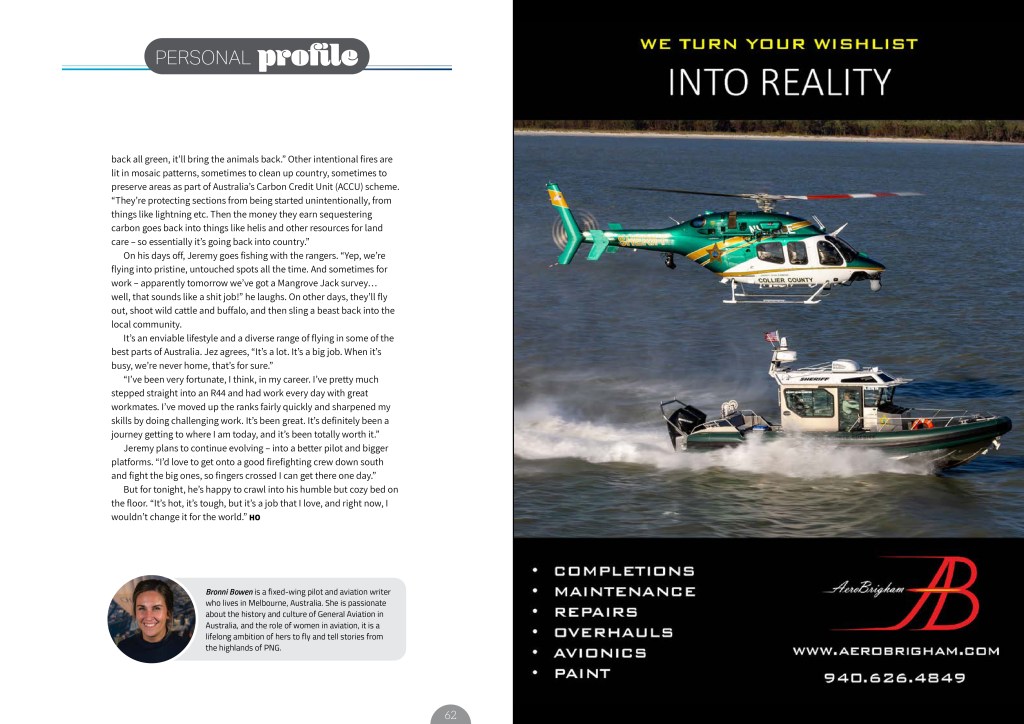 “I’ve been very fortunate, I think, in my career. I’ve pretty much stepped straight into an R44 and had work every day with great workmates. I’ve moved up the ranks fairly quickly and sharpened my skills by doing challenging work. It’s been great. It’s definitely been a journey getting to where I am today, and it’s been totally worth it.”