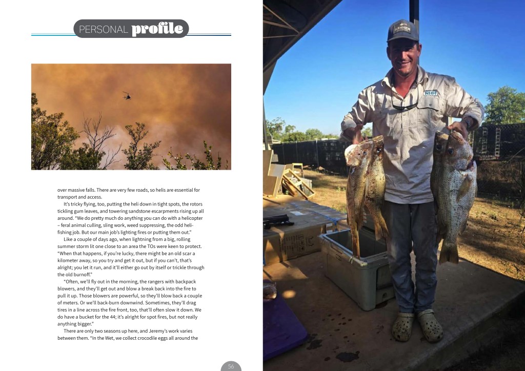 There are only two seasons up here, and Jeremy’s work varies between them. “In the Wet, we collect crocodile eggs all around the NT, then as the Dry starts to set in, we mainly fly around burning the country to protect it from late-season wildfires.” Incendiary programs for strategic early burns run from May to August, and it’s flat out – six hours a day, six days a week, for weeks and weeks. “Then, as the summer build-up hits, we are out fighting fires started by the big storms and late ground burning.”