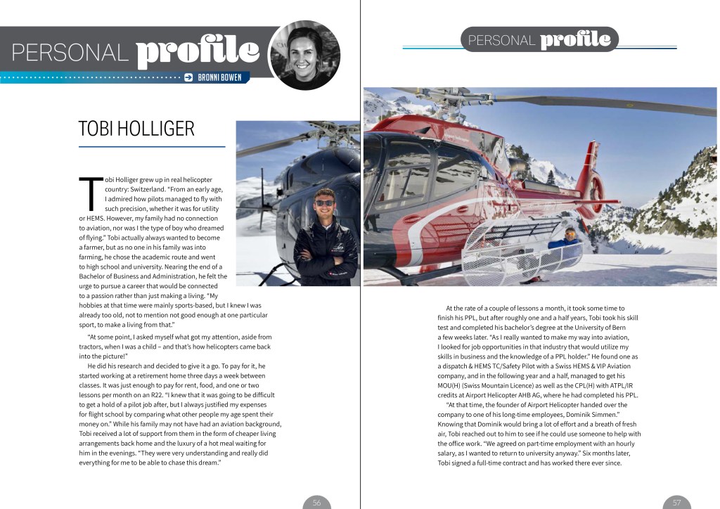 At the rate of a couple of lessons a month, it took some time to finish his PPL, but after roughly one and a half years, Tobi took his skill test and completed his bachelor’s degree at the University of Bern a few weeks later. “As I really wanted to make my way into aviation, I looked for job opportunities in that industry that would utilize my skills in business and the knowledge of a PPL holder.” He found one as a dispatch & HEMS TC/Safety Pilot with a Swiss HEMS & VIP Aviation company, and in the following year and a half, managed to get his MOU(H) (Swiss Mountain Licence) as well as the CPL(H) with ATPL/IR credits at Airport Helicopter AHB AG, where he had completed his PPL.