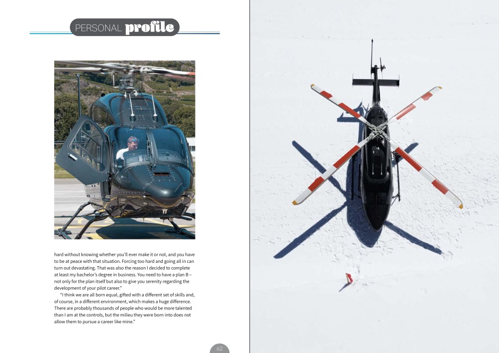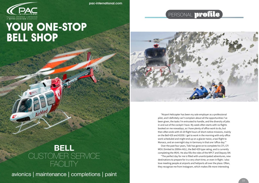 “Airport Helicopter has been my sole employer as a professional pilot, and I definitely can’t complain about all the opportunities I’ve been given, the tasks I’m entrusted to handle, and the diversity of jobs in and out of the cockpit I have. My week often starts with no flights booked on me nowadays, as I have plenty of office work to do, but then often ends with 10-20 flight hours of short-notice missions, mainly on the Bell 429 and AS350. I get to work in the morning with only office work scheduled and might end up on a glacier twice, a taxi flight to Monaco, and an overnight stay in Germany in that one ‘office day.'”