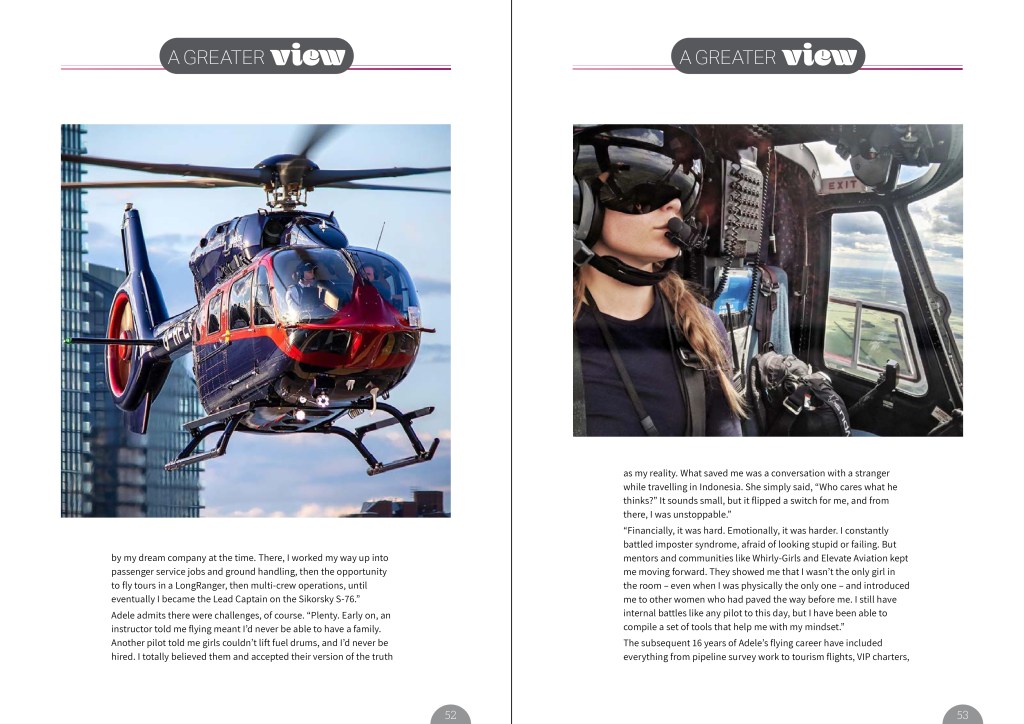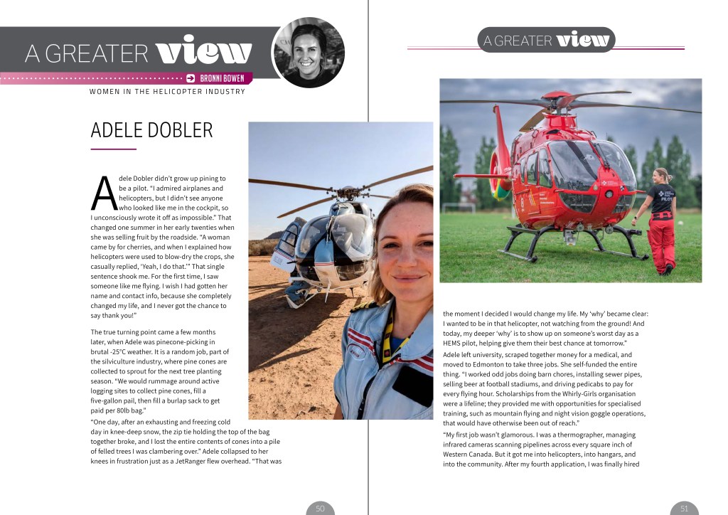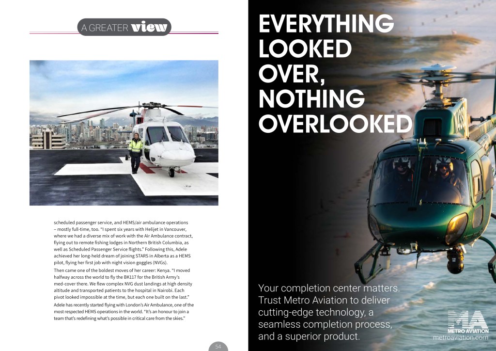 Adele plans to keep flying HEMS for as long as possible and advance within the company; it’s the most meaningful work she knows. “And, I hope to continue mentoring the next generation of women in aviation and give back to my community, so that one day, a girl won’t have to wonder if she belongs in the cockpit; she’ll just know she does.”